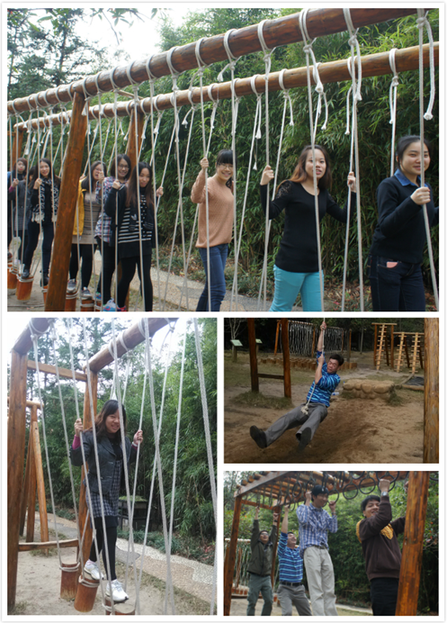 室內(nèi)激烈的互動(dòng)過后,便是戶外的體能拓展。第二天我們來到了賀州市姑婆山風(fēng)景區(qū),進(jìn)行了戶外拓展。在姑婆山五里坪拓展訓(xùn)練基地中,我們揮灑了汗水、鍛煉了體魄。其中最有意思的一個(gè)項(xiàng)目就是木樁橋,需要隊(duì)員們并列在搖晃不定的木樁橋上行走,培養(yǎng)了團(tuán)隊(duì)合作精神,鍛煉了每位隊(duì)員的耐力,使大家充分意識(shí)到團(tuán)結(jié)、協(xié)作的重要性,有效地發(fā)揮了團(tuán)隊(duì)凝聚力。