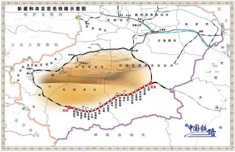 和若鐵路的建成通車,結(jié)束了和田地區(qū)洛浦、策勒、于田、民豐等縣和巴音郭楞蒙古自治州且末縣等地不通火車的歷史,進一步完善了新疆鐵路網(wǎng)結(jié)構(gòu),加快了西部邊疆鐵路網(wǎng)建設(shè),極大便利了沿線各族人民群眾出行和貨物流通,帶動了沿線資源開發(fā),對維護民族團結(jié)、鞏固邊疆國防、助力鄉(xiāng)村振興,具有十分重要的意義。